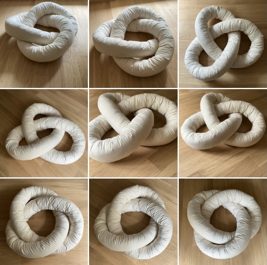 #ProjectYFASMA, https://www.benakishop.gr/en/project/projectyfasma Trefoil Knot - 2024 I cut the 160 Χ 150 cm piece of fabric into three equal strips of 160 Χ 50 cm. These were sewn together into a long strip of 480 Χ 50 cm which was then sewn into a tube open at each end. I stuffed the tube with 7 kilos of 100% cotton to make a flexible cylinder. Some hours of stomping and slapping were required to even out the filling. I then tied the cylinder into a trefoil knot by sewing its beginning to its end with waxed linen thread.The dimensions 90 Χ 90 Χ 30cm are variable. |
